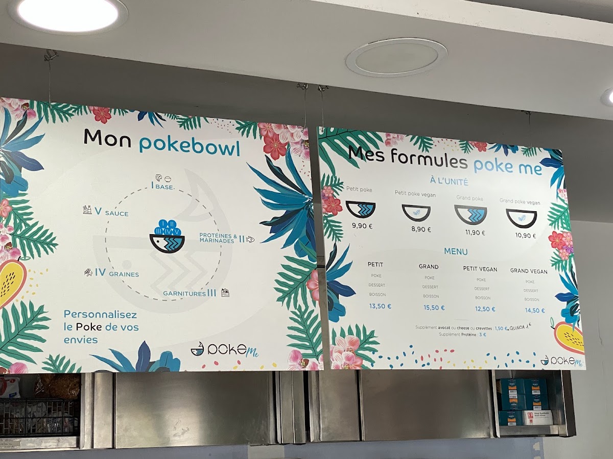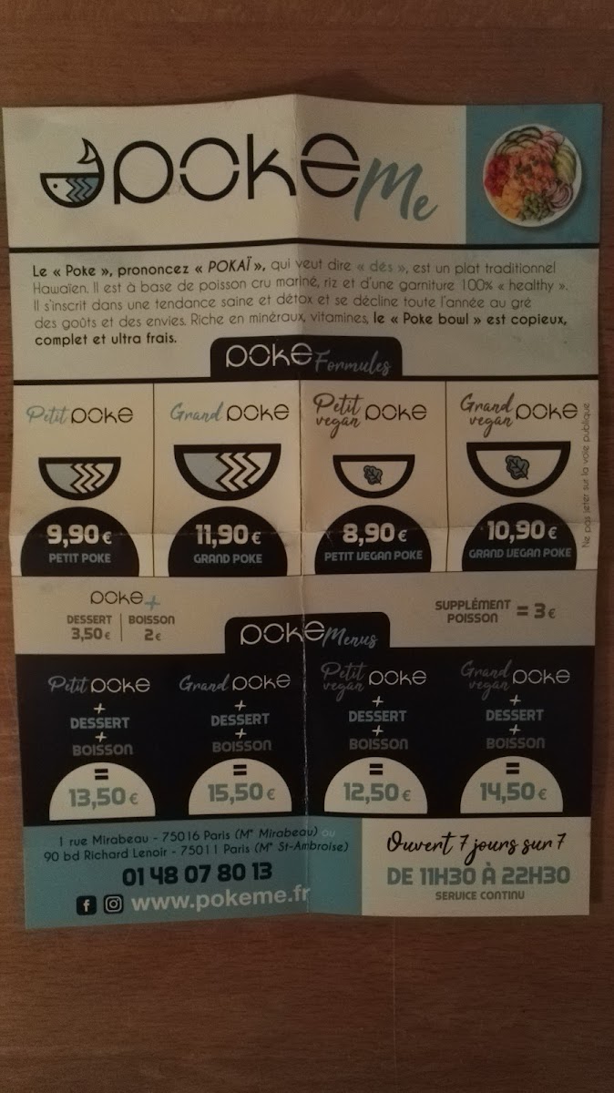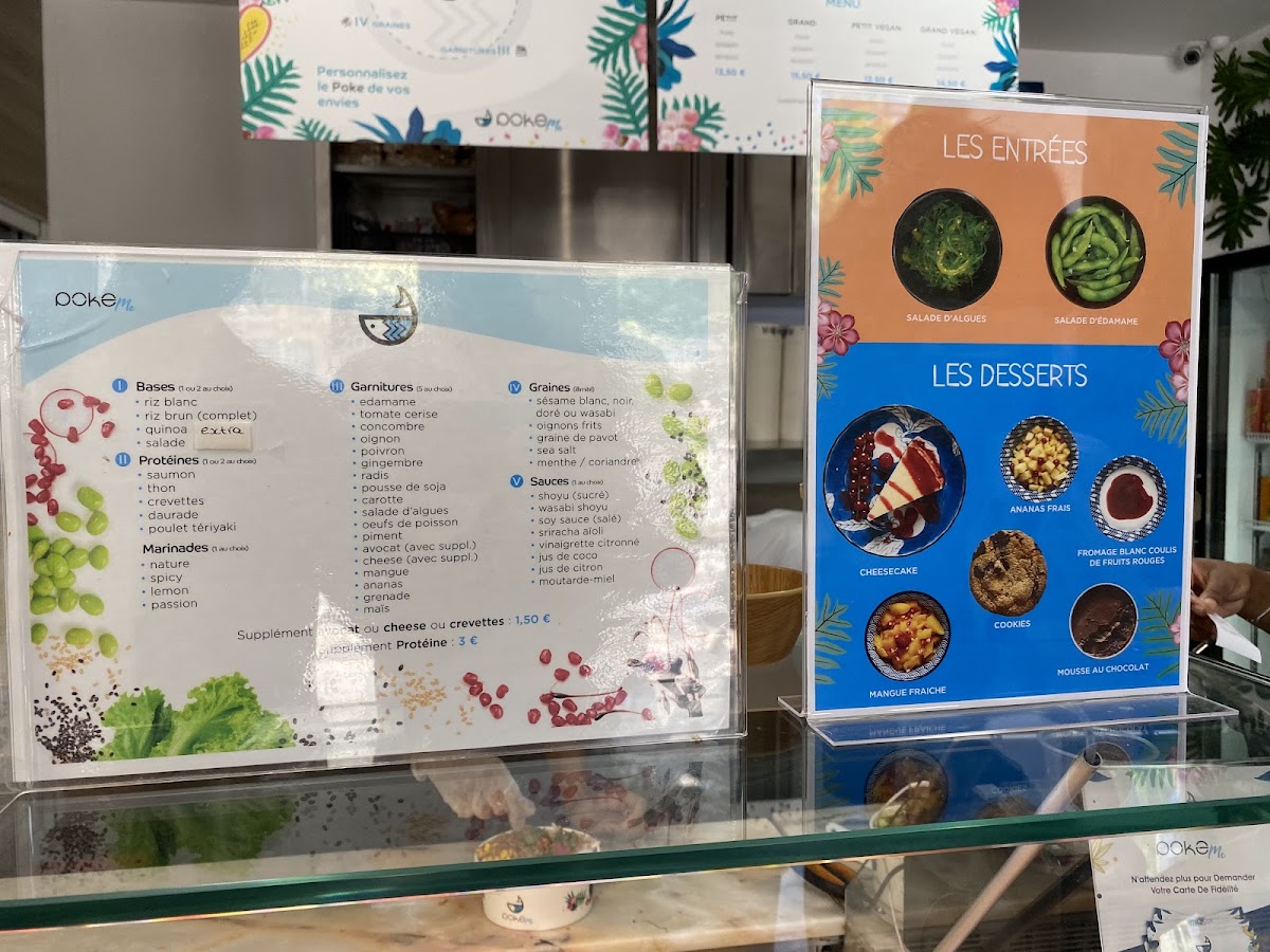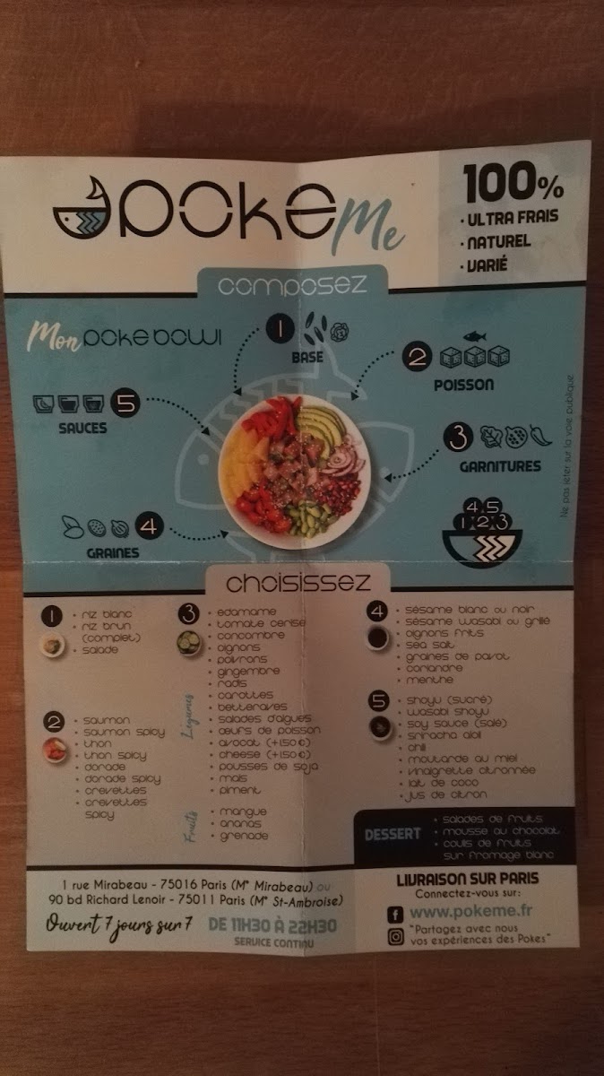 Poke Me offers a diverse and customizable menu that showcases the vibrant flavors of poké bowls, along with fresh sides and indulgent desserts. You can begin with options like the Salade D'edamame or Salade D'algues Wakamé, both light and refreshing. When it comes to the main event, the "Composez: Mon Pokebowl" lets you create your ideal bowl with a variety of bases such as Riz Blanc, Riz Brun, or QuinoaSalade, and proteins like Saumon, Thon, Crevettes, or Poulet. For those seeking a bit more spice, there's the Sauman Spicy or marinades such as Spicy or LemonPassion. The bowls are packed with vibrant garnishes, including Edamame, Tomate Cerise, and Chou-Fleur, and topped off with a selection of sauces like Shoyu, Wasabi Shoyu, and Vinaigrette Citronnée. For dessert, the Cheesecake, Mousse Au Chocolat, and Salade De Fruits provide a sweet, satisfying end to the meal. For a unique twist, the Cous De Nuts Sur Fromage Blanc offers a rich combination of fresh flavors and textures. Whether opting for a Petit Poke Vegan or a Grand Poke, Poke Me’s menu caters to a range of tastes, combining fresh ingredients with bold, zesty choices for a fulfilling dining experience.