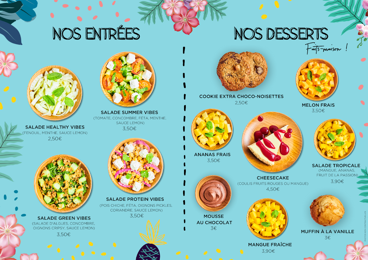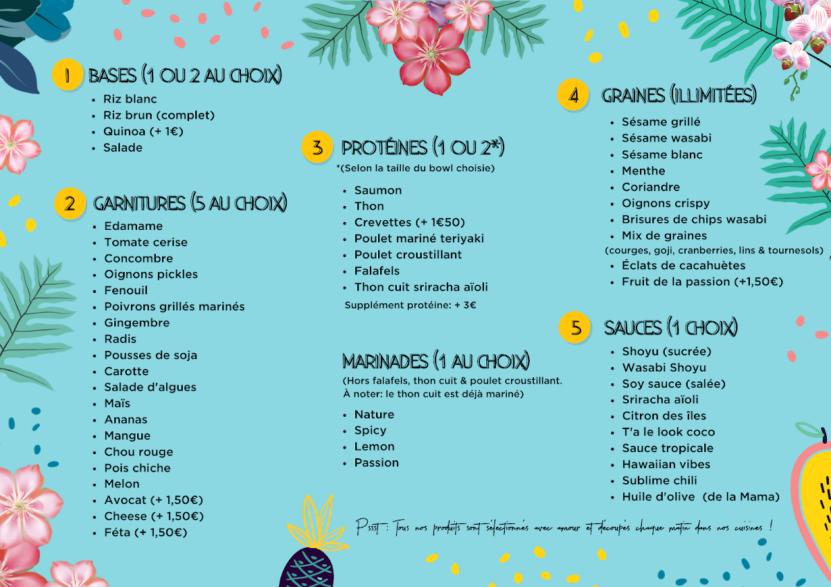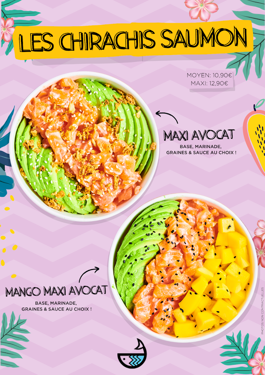 Poke Me offers a diverse and customizable menu that showcases the vibrant flavors of poké bowls, along with fresh sides and indulgent desserts. You can begin with options like the Salade D'edamame or Salade D'algues Wakamé, both light and refreshing. When it comes to the main event, the "Composez: Mon Pokebowl" lets you create your ideal bowl with a variety of bases such as Riz Blanc, Riz Brun, or QuinoaSalade, and proteins like Saumon, Thon, Crevettes, or Poulet. For those seeking a bit more spice, there's the Sauman Spicy or marinades such as Spicy or LemonPassion. The bowls are packed with vibrant garnishes, including Edamame, Tomate Cerise, and Chou-Fleur, and topped off with a selection of sauces like Shoyu, Wasabi Shoyu, and Vinaigrette Citronnée. For dessert, the Cheesecake, Mousse Au Chocolat, and Salade De Fruits provide a sweet, satisfying end to the meal. For a unique twist, the Cous De Nuts Sur Fromage Blanc offers a rich combination of fresh flavors and textures. Whether opting for a Petit Poke Vegan or a Grand Poke, Poke Me’s menu caters to a range of tastes, combining fresh ingredients with bold, zesty choices for a fulfilling dining experience.